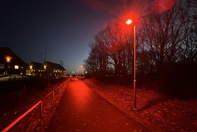 Nu lyser den röda fladdermusvänliga belysningen bredvid Henriksdalskolan i Höllviken.